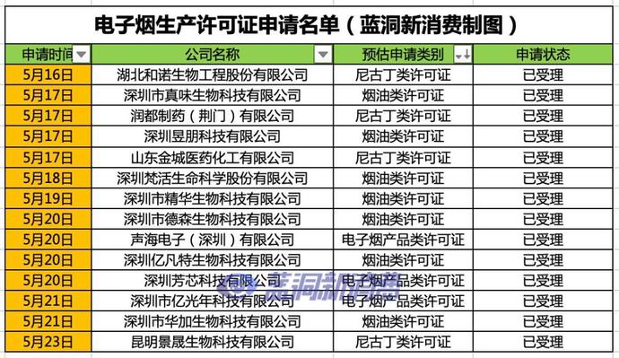 蓝洞新消费报道,5月27日消息,截至目前,国家烟草专卖局官网进入5月以来的办事公示信息显示,已经有14家电子烟企业申请了烟草专卖生产许可证核发,目前均为已受理状态。